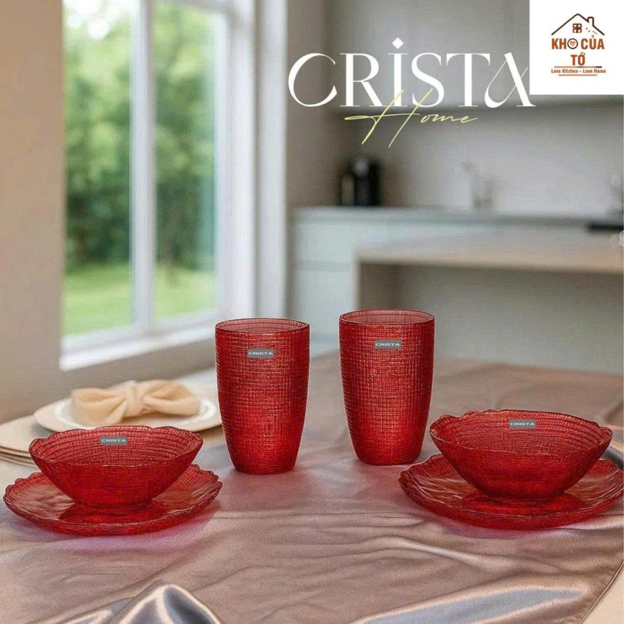 Bộ 6 món thủy tinh Crista màu đỏ vân lưới dập nổi, thủ công tinh xảo – sang trọng, lấp lánh, chuẩn setup bàn tiệc 5 sao.