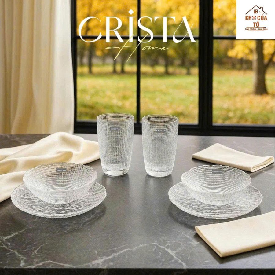 Bộ 6 món thủy tinh Crista trắng vân lưới dập nổi tinh tế, sang trọng, dễ phối mọi phong cách bàn ăn và quà tặng cao cấp