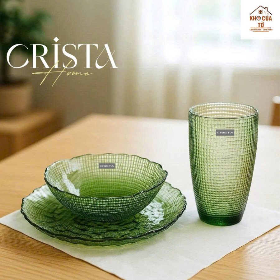 Bộ 6 món thủy tinh Crista xanh olive vân lưới dập nổi – thủ công tinh xảo, sang trọng, phù hợp decor bàn tiệc & quà tặng