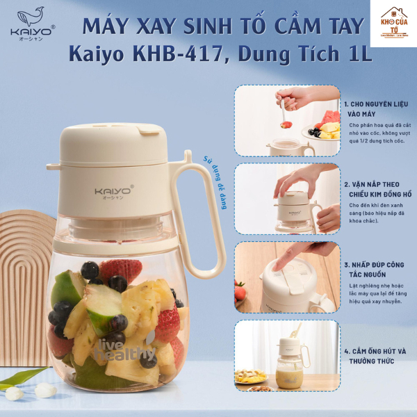 Máy xay sinh tố cầm tay Kaiyo KHB-417 1000ml, 12 lưỡi inox, xay đá mạnh, sạc Type-C, pin 1500mAh, tiện mang theo