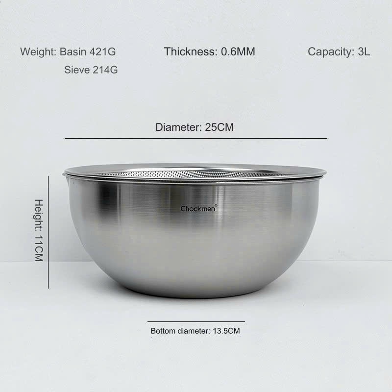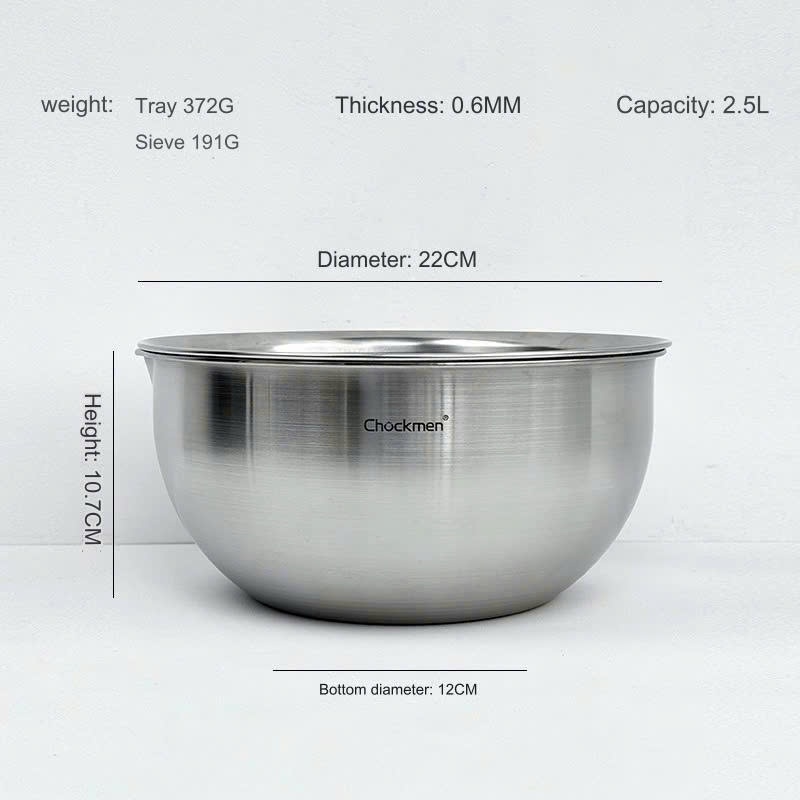 – size 22cm:đường kính 22cm, cao 10.7cm, đáy 12cm, dày 0.6mm, dung tích 2.5L, trọng lượng chậu 372g, trọng lượng rổ 191g