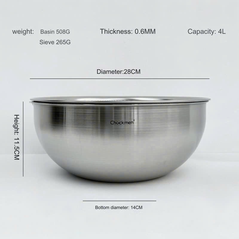 – size 28cm: đường kính miệng 28cm, cao 11.5cm, đáy 14cm, dày 0.6mm, dung tích 4L, trọng lượng chậu 508g, trọng lượng rổ 265g