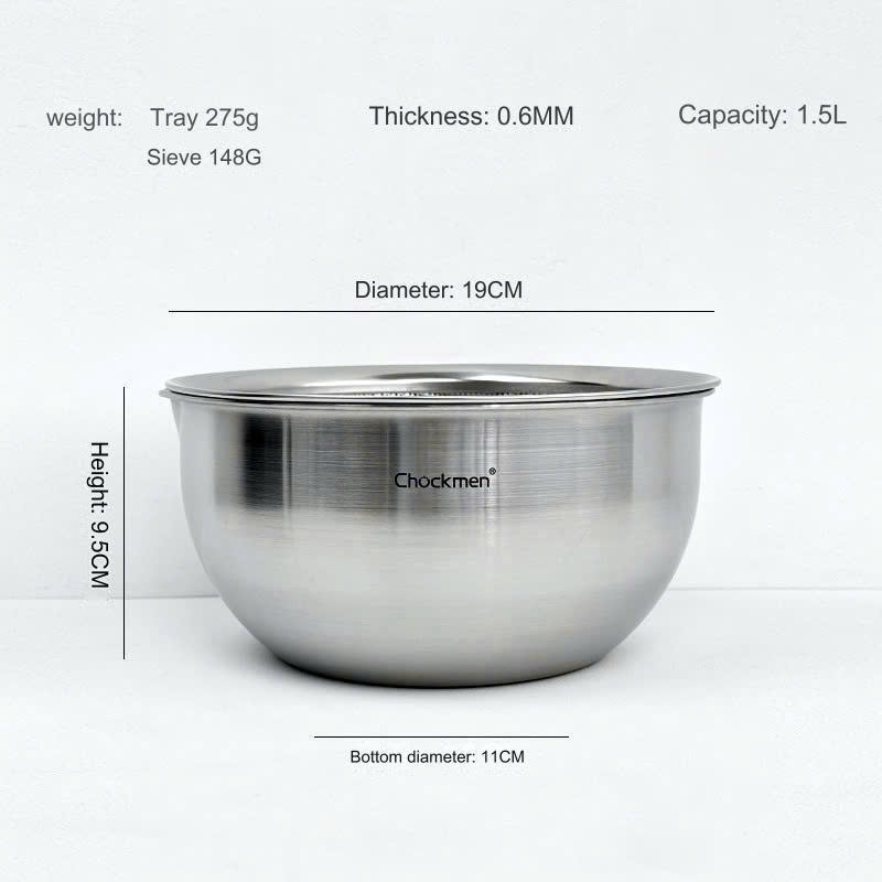 – size 19cm: đường kính miệng phủ vành 20cm, cao 9.5cm, đáy 11cm, độ dày 0.6mm, dung tích 1.5L, trọng lượng chậu 275g, trọng lượng rổ 148g
