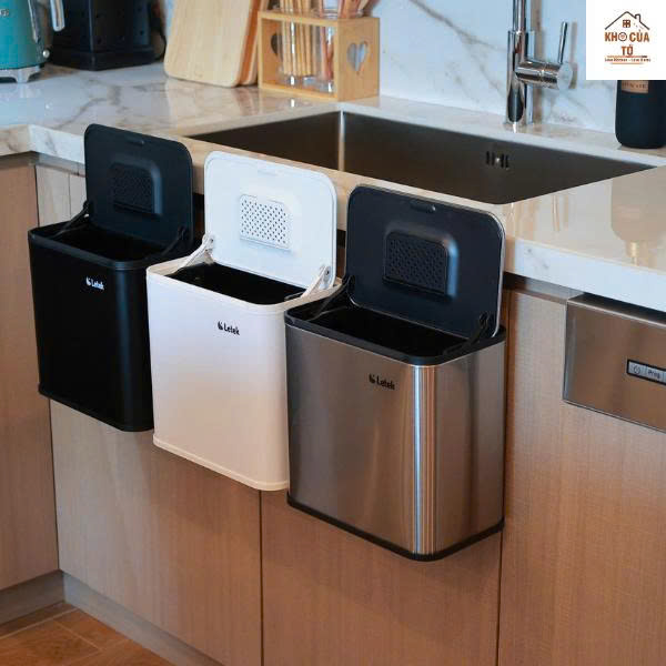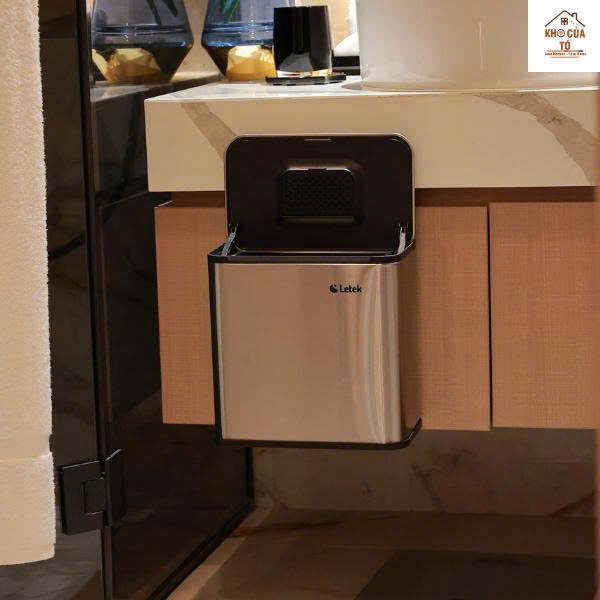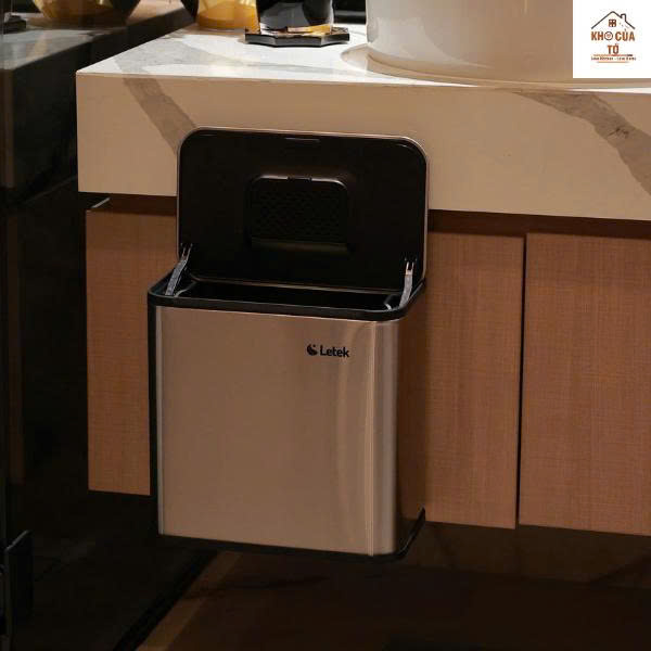 Thùng rác treo tủ Letek LC05 5L inox cao cấp, nắp kín khử mùi than hoạt tính, thiết kế 2 cách mở tiện lợi.