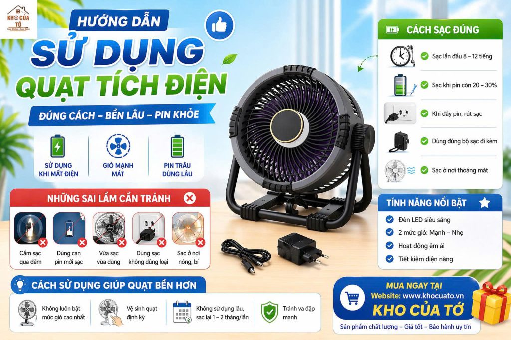 Nhiều người sử dụng quạt tích điện mỗi ngày nhưng lại vô tình làm giảm tuổi thọ pin do dùng sai cách. Bài viết này sẽ giúp bạn hiểu rõ cách sử dụng quạt tích điện Tiross đúng chuẩn và những lưu ý quan trọng để thiết bị luôn bền như mới.